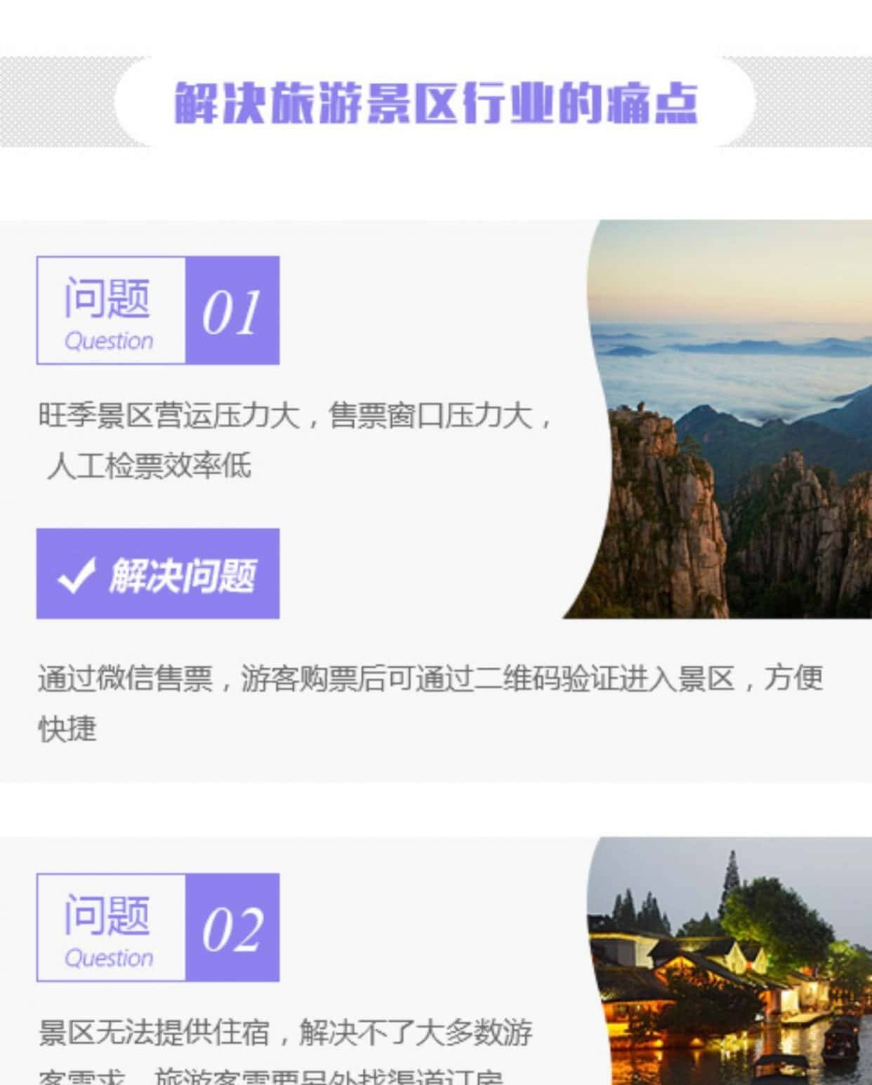 旺季景区营运压力大,售票窗口压力大人工检票效率低。通过微信售票,游客购票后可通过二维码验证进入景区,方便快捷。